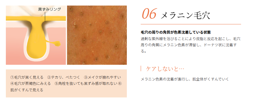 濃く、目立つしみ 長年の紫外線から肌を守るために作られ続けたメラニンが、排出しきれずに蓄積し、濃いしみ(老人性色素斑など)となって現れます。